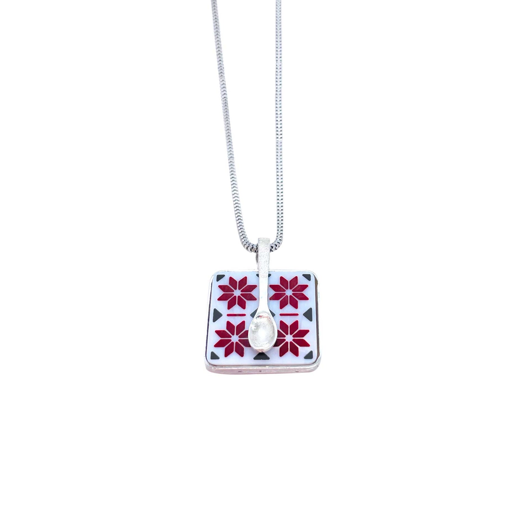 A tribute to courage, creativity, and the will to break free. Silver pendant with mother of pearl and enamel.